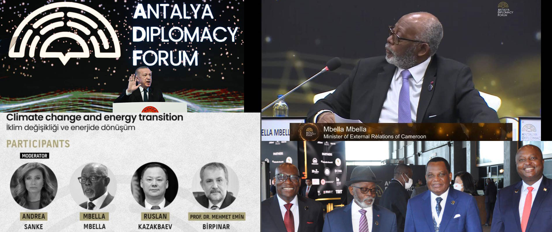 S.E. MBELLA MBELLA, Ministre des Relations Extérieures conduit la Délégation Camerounaise au Deuxième Forum Diplomatique d’Antalya (ADF) qui se tient du 11- 13 Mars 2022 à Antalya-Turquie, sous le thème général "Reconstruire la Diplomatie". En effet, cette 2ème Edition de l’ADF servira de plate-forme pour des discussions interactives sur les aspects clés autour de la Reconstruction de la Diplomatie afin de l’adapter aux défis présents. Y prennent part, les professionnels du monde de la Diplomatie, principalement les Hauts Dirigeants Politiques, les Diplomates, les responsables des Organisations Internationales, les personnalités de renommée mondiale dans les domaines politique et sociale, les leaders d’opinion, les membres éminents de la Communauté Universitaire, les hommes de médias les représentants du monde des affaires et les Membres de la Société Civile. La cérémonie officielle de ce Forum s'est déroulée le 11 mars 2022 sous le Haut Patronage de S.E. RECEP TAYYIP ERDOGAN, Président de la République de Turquie. Outre le thème central, plusieurs thématiques qui touchent les défis actuels façonnant l’agenda mondial, feront l’objet de discussions tout au long du Forum.
